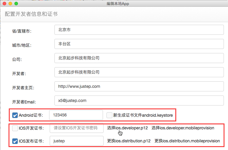 如果极光推送应用里配置的是开发环境,需要√选“iOS开发证书”,输入证书密码(P12文件的密码),然后选择P12文件ios.developer.p12和APP证书ios.developer.mobileprovision。(证书文件名称没有要求,平台会自动将文件名称修改为标准的并拷贝至生成APP的文件夹下)